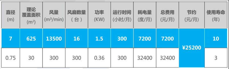 一台直径7M的海天III覆盖面积约等于19个0.75M小风扇。例如在一个1万平方米的厂房里,全面覆盖需要小型风扇约300台,而海天III工业节能风扇仅需16台。按使用5年,每年6个月,每天10小时计算,约合计运行9000小时,海天III耗电216000KW.h,小型风扇972000KW.h,节能756000KW.h,节能78%!